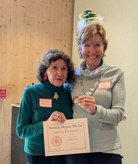 The highlight of the celebration was for Co-President Janie Hagan to present the 2025 Bronze Medal Award to Sandra Frank. Sandra is a long-time member of the Nashville Rose Society, including serving as 2009 President. Sandra is a team player and is the first to show up whenever anything needs to be done. She makes certificates for the Nashville rose shows and works in the Cheekwood Rose Study Garden. She is a volunteer for Cheekwood and is a member of both the Herb and Perennial Societies. She is very deserving of this medal. Congratulations, Sandra!